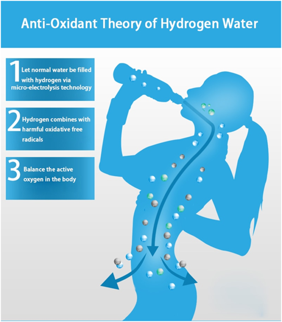 Hydrogen-rich water is often promoted for its antioxidant potential: molecular hydrogen may help neutralize free radicals — unstable molecules that can cause oxidative stress in the body. Drinking hydrogen water may support hydration, post-exercise recovery, and general wellness as part of a balanced lifestyle. (Note: results vary by person and research is ongoing.)